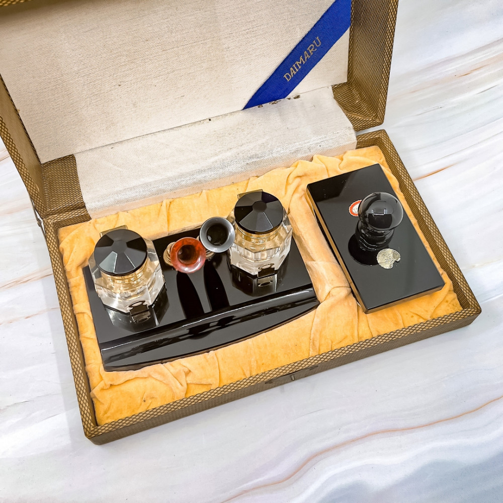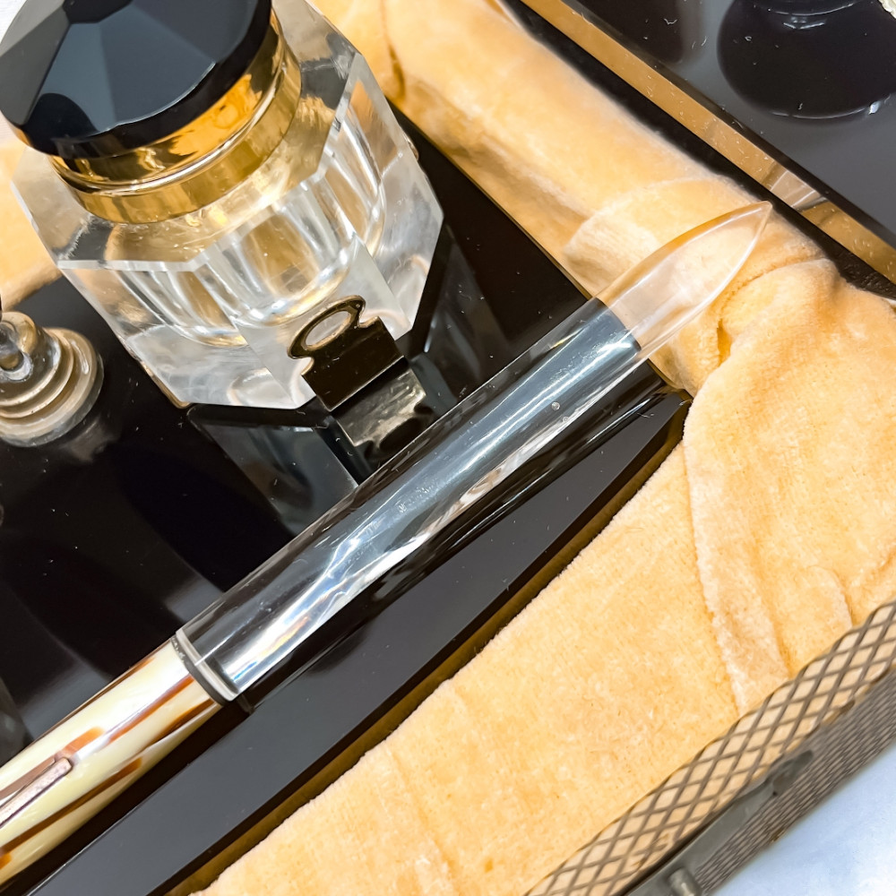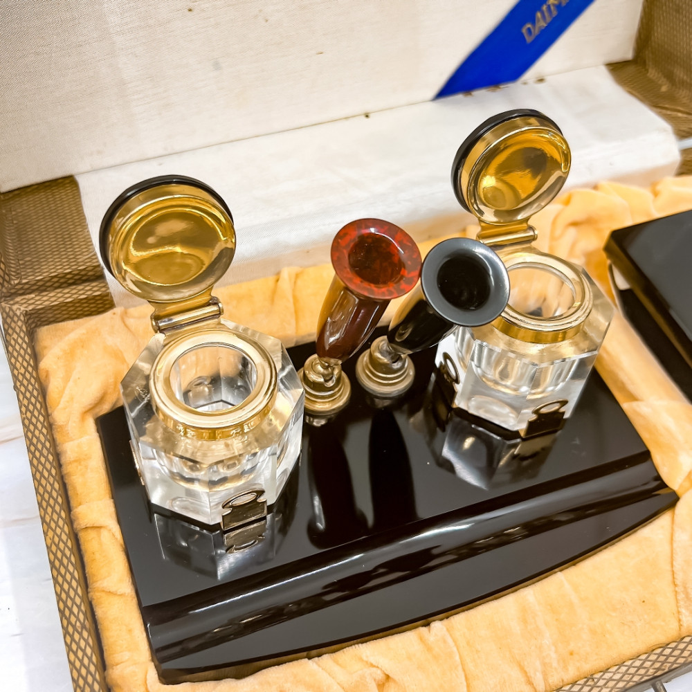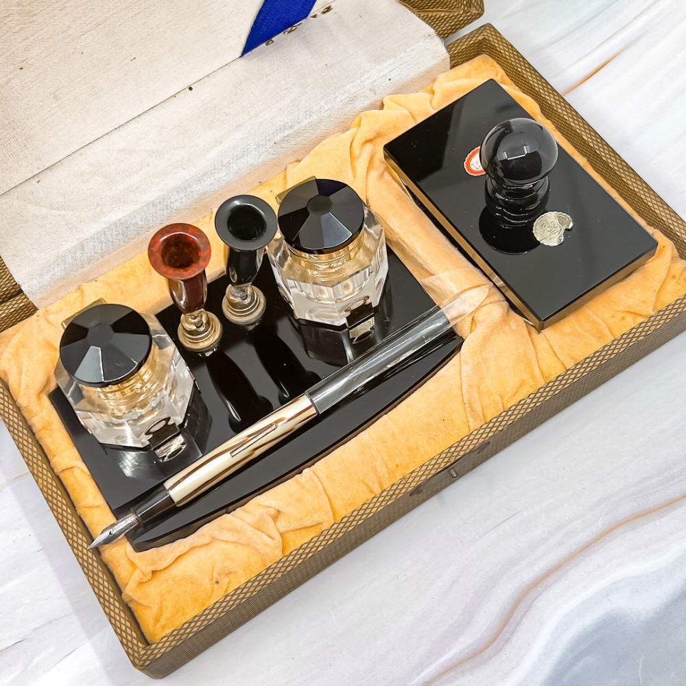 全新Vintage文具組  鋼筆筆座 水晶墨水瓶 壓墨器 附賽璐璐鋼筆一支(拉桿上墨)