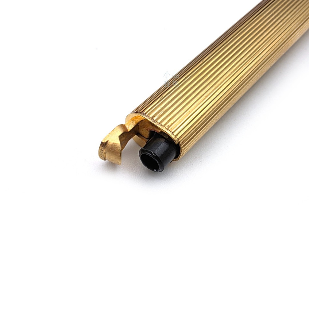 筆身以 金色鍍層金屬 製成,線條流暢,刻有 Godron(直條凹槽)雕紋,在光線下折射出細膩金屬光澤,展現珠寶級金工質感。