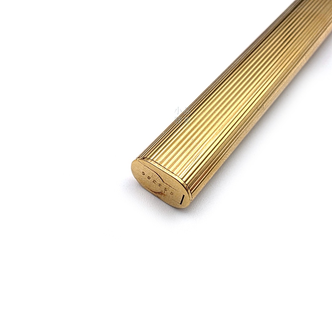 筆身以 金色鍍層金屬 製成,線條流暢,刻有 Godron(直條凹槽)雕紋,在光線下折射出細膩金屬光澤,展現珠寶級金工質感。