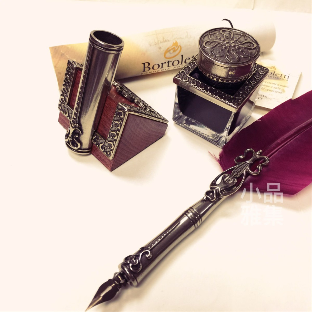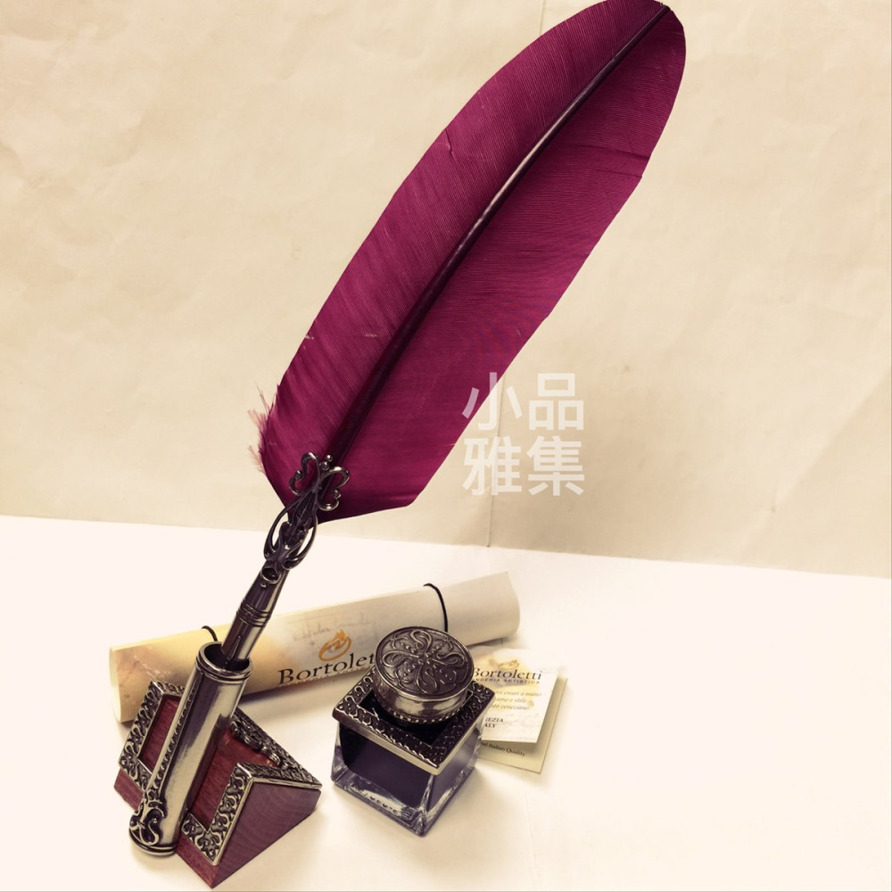 義大利 Bortoletti set82 羽毛沾水筆+墨水一瓶+筆座 組合(bordeaux波爾多紅羽毛款)