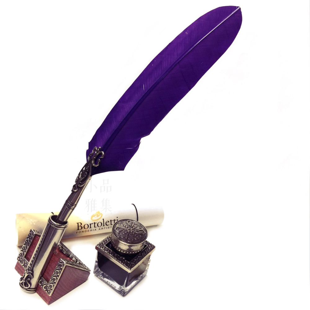 義大利 Bortoletti Set82 羽毛沾水筆+筆座+30ml黑色墨水一瓶(紫羅蘭羽毛)