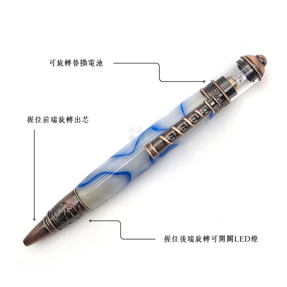 筆帽頂端內建 LED 燈,輕轉握位後端即可開關,提升收藏趣味性