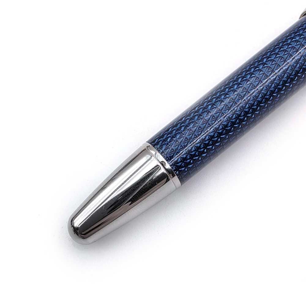 筆身以深藍色為基底,搭配立體細緻的幾何菱格紋理,呈現出如西裝布料般的高雅質感,不僅視覺吸睛,觸感也極具層次。